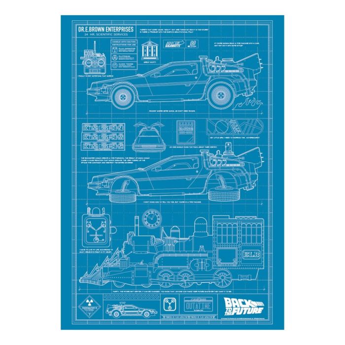 "Featuring blueprint designs for the original DeLorean from Back to the Future, the modified flying DeLorean from Back to the Future Part II, and the steam train time machine from Back to the Future Part III, this limited edition art print is produced at one of the oldest commercial printers in the UK. Limited to 995 worldwide, each one is hand-numbered and is A3 in size.