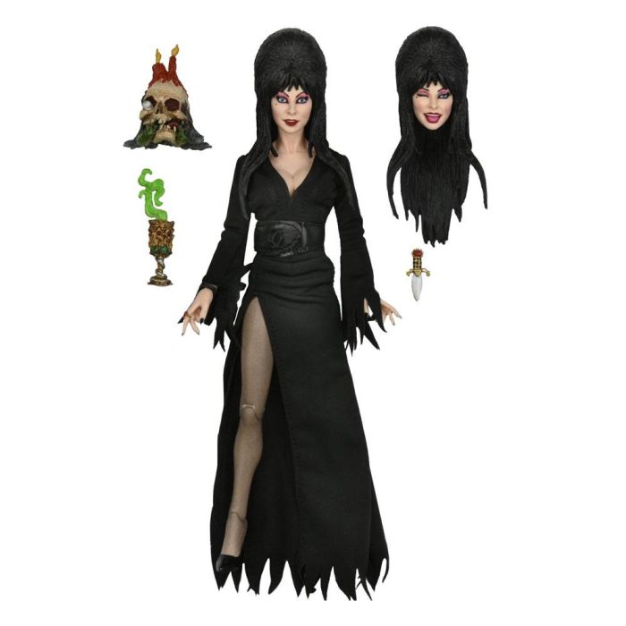 Celebrating 40 years of Elvira, Mistress of the Dark! The devilishly delightful Cassandra Peterson has played the part of Elvira for 40 years with grace, humor and more than a little camp. NECA is proud to present this fiendishly fantastic figure for your horror collection. The 8" Elvira action figure is fully articulated and features tailored fabric clothing, plus plenty of accessories... alternate winking head, skull, chalice, figure stand, and her signature dagger, which slips into a loop on the belt.