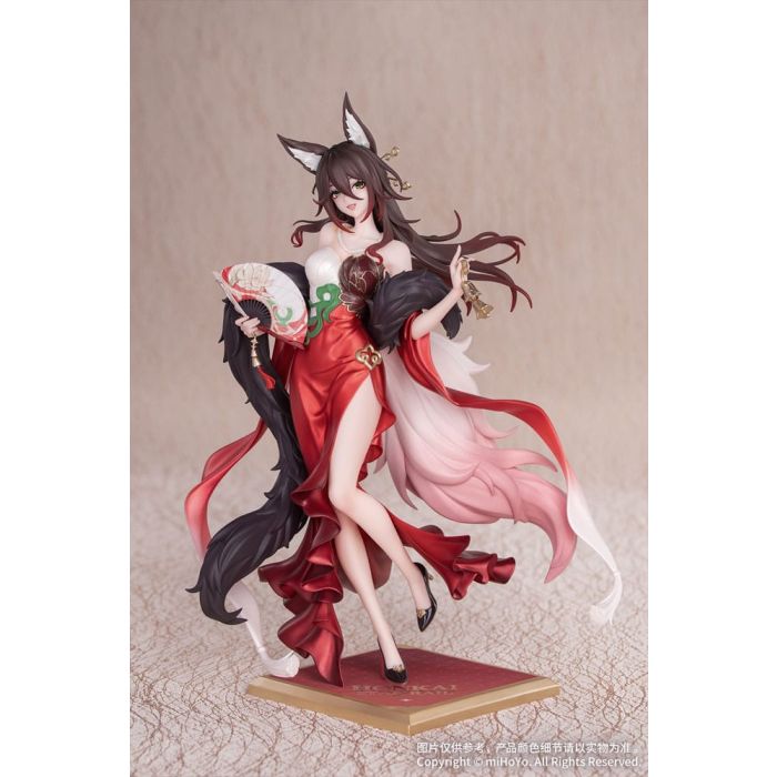 Fugue is dressed in a cheongsam, adorned with intricate embroidery outlined in gold thread across the front. The high-slit design of the skirt highlights her graceful silhouette, while the soft shawl pairs perfectly with her fluffy fox tail. She gently rings the bell in her left hand, its crisp chime said to summon good fortune. In her right, she holds a folding fan, her sleeves flowing with the motion. The figure captures a look that is both magnificent and imbued with a lively, ethereal charm.