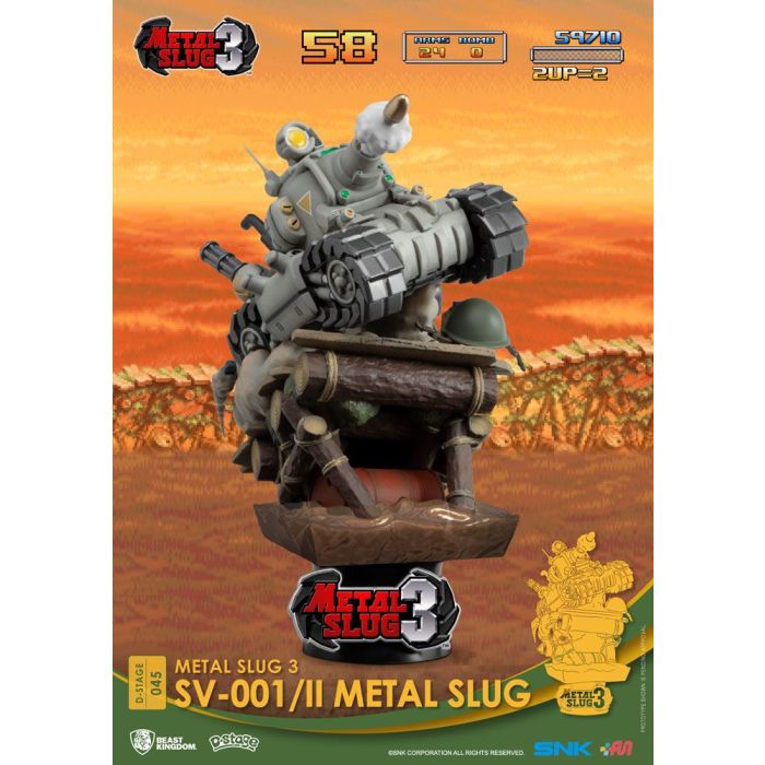 The 'staging your dreams' collection is back with a familiar scene from Metal Slug 3, a celebrated game from the SNK gaming series! Get ready for some real action with the SV-001/II Metal Slug, a battle tank that may look round, but packs a powerful punch. Recreated in 360-degree glory, the SV-001/II Metal Slug is seen in the midst of climbing a seriously unsteady looking wooden bridge and firing its famous canon!