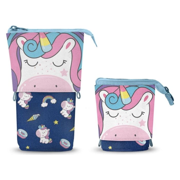 Vertical pencil case with one top zipped compartment and inner lining. Its movable top allows it to be converted into a pencil holder.