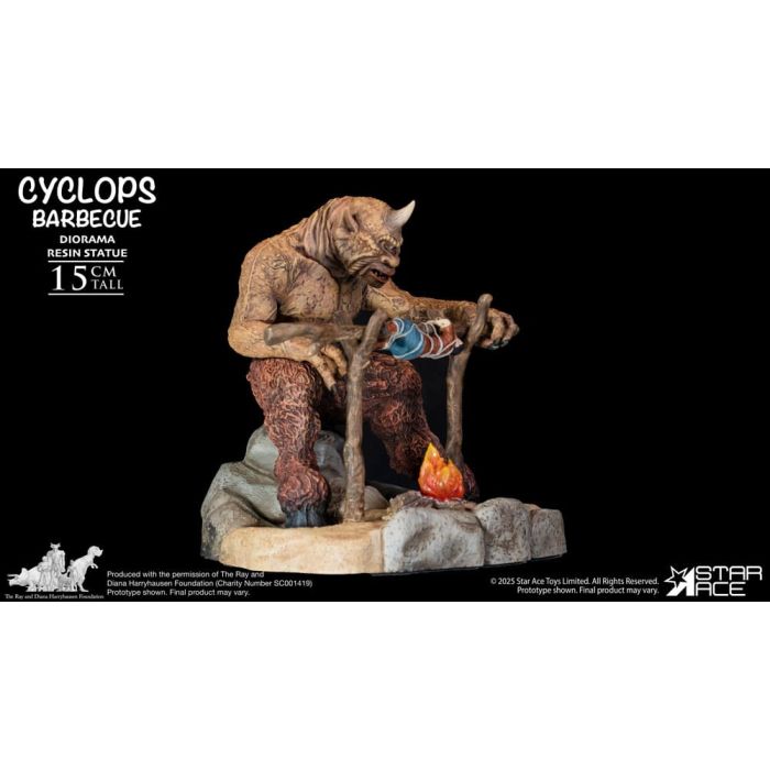 Introducing the stunning Star Ace Polyresin Diorama "Cyclops Barbeque," inspired by the iconic Ray Harryhausen classic, The Seventh Voyage of Sinbad. This meticulously crafted piece captures the thrilling moment when the fearsome Cyclops prepares to roast one of Sinbad's unfortunate crew members. Standing at 17cm tall, this diorama brings the legendary scene to life with exquisite detail and artistry. Perfect for collectors and fans of classic fantasy cinema, the "Cyclops Barbeque" is a must-have addition to your collection. Embrace the adventure and relive the magic of Harryhausen's timeless masterpiece!