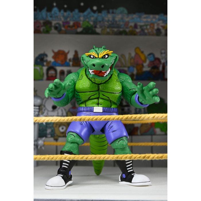 A first-time figure straight from the pages of Eastman and Laird's Teenage Mutant Ninja Turtles Adventures comic book series from Archie Comics! This 7-inch scale Stump Wrestling Leatherhead action figure by NECA features a hinged jaw to chomp the champ and a bendy wire tail to bash turtle brains! It also includes extra hands and comes in reliable window box packaging with original box art by Ken Mitchroney.