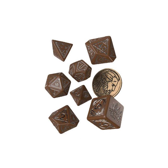 Inspired by The Witcher franchise, this dice set is dedicated to Geralt of Rivia - a witcher who calls all his horses Roach. The set contains 8 pieces; 7 polyhedral dice, and a metal coin featuring Geralt's depiction, which acts as a D2. Each die is painted brown with silver engravings. The highest value faces and coin reverse display the Wolf School symbol.